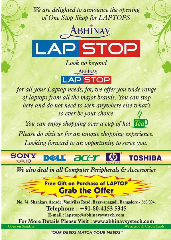 No. 74,Shankara Arcade,Vanivilas Road Basavangudi, Bangalore - 560 004 Tel : +91-80-4153 5345 Fax: +91 -80 -2661 8044 E-mail : lapstop@abhinavsystech.com